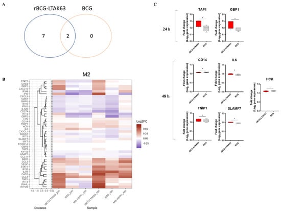 3.3. BCG Induces Downregulation of an Inflammatory Gene Profile in M2 Macrophages, While rBCG-LTAK63 Maintains or Induces Upregulation for 48 h