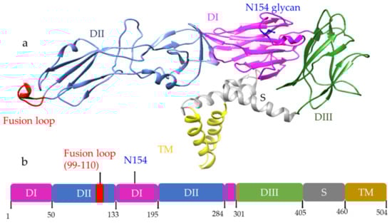 (a) Structure of E protein monomer (PDB ID: 5IRE) of ZIKV is shown in ribbon form. (b) Schematic of E protein showing residue positions of the all the domains. The domains are color coded as shown. Domain I (DI); Domain II (DII); Domain III (DIII); Stem (S); Transmembrane (TM) region. DI has an N-linked glycan (N154).