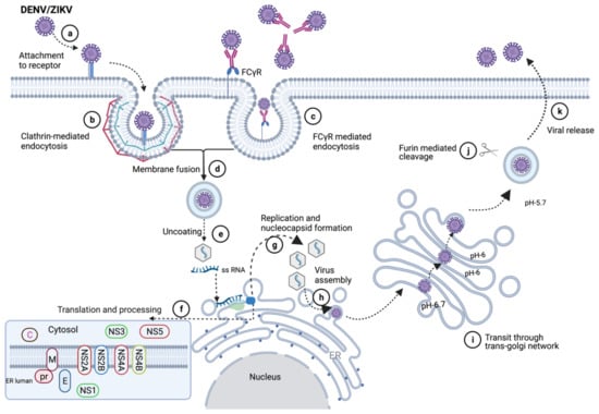 DENV/ZIKA virus entry and release pathway []. The virus attaches with the cellular receptors (a) it undergoes Clathrin-mediated (b) or FCγ mediated endocytosis (c), the virus fuses with the endosomal membrane (d), virus genetic material releases in the cytoplasm (e), translates to protein (f), replication and nucleocapsid formation occurs (g), virus assembles in ER (h), immature virus moves through the trans-golgi network (i), cleaved via Golgi protease (j), and the virus releases outside of the cell (k).