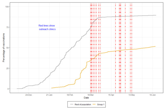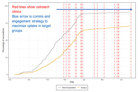 Percentage of population vaccinated (first doses) for Group 2 vs. the rest of the BNSSG population. The red dotted lines represent some of the outreach activities.