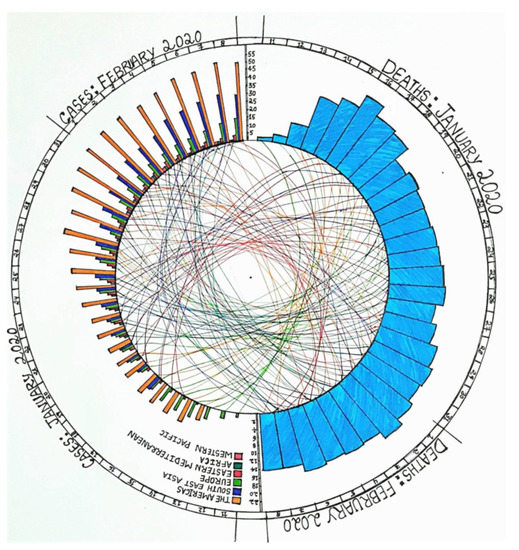 Initial epidemiology of COVID-19 in 2020. This circular plot represents the progressive increase in the number of infections/cases in the beginning of 2020 world wide. The left half of the circle shows the number of increasing cases per country over a period of one month (11 January to 8 February 2020). Right half of the circle shows the number of deaths over the same period of time from the countries listed taken together. Correlations are shown as lines in the center of the circle connecting the relevant data points from two halves of the circle.