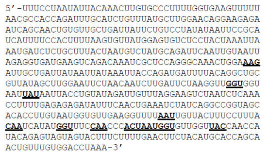 Viral mRNA sequence that was considered in this study. In this sequence, the starting triplet codon UUU was taken as the first codon and hence the corresponding amino acid for UUU was taken as the first amino acid in this study. Triplets that were analyzed in this study are highlighted in bold font and were underlined.