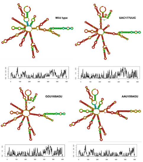 Comparative analysis of the AMFE values revealed three mutant triplets (AAU159AGU, GGU168AGU, and UAC177UUC) in particular that have higher values compared to the wild type (Table S1). The secondary structure of mRNA for these three mutants and the wild type are shown in Figure 3 along with their corresponding entropic profiles. The mutant AAU159AGU resembled the wild type mRNA while the other mutants showed more similarities with each other rather than with the wild type mRNA. The mutants GGU168AGU and UAC177UUC not only showed similarities in their mRNA secondary structures with each other but also exhibited similar entropic profiles (Figure 3). The entropic profile of AAU159AGU mutant showed some similarity to that of the wild type but is evidently different from the other two mutants.