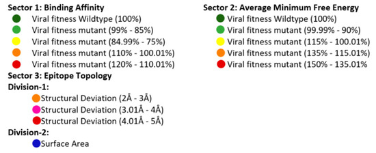 Furthermore, the AMFE values of all the mutants (Table S1) were used to arbitrarily predict the relative viral fitness of those mutants by taking the wild type as 100%. As shown in Table S1, the above-mentioned three mutants were found to have higher relative viral fitness roughly 1.4-fold higher than the wild type viral fitness. This increase in the viral fitness may not seem to be dangerous, but when these calculations are compared with the structural deviations of various mutant RBDs, then a comprehensive conclusion can be made with respect to the threat levels posed by these mutants against the current vaccines that are based on wild type RBD. The viral fitness values of all the chosen mutant models that were calculated based on the AMFE values are conveniently plotted in a circular plot as shown in Figure 4. The mutants exhibiting higher relative viral fitness values are represented by red bars followed by orange and yellow bars while the mutants that exhibited relative viral fitness similar to the wild type are shown as dark green bars. Mutants that exhibited lower relative viral fitness values compared to the wild type are indicated by the light green bars. In summary, out of the 74 mutants represented in the circular plot (Figure 4), around 33 mutants (~45%) exhibited lower relative viral fitness compared to the wild type while the rest exhibited either equivalent or higher relative viral fitness compared to the wild type.