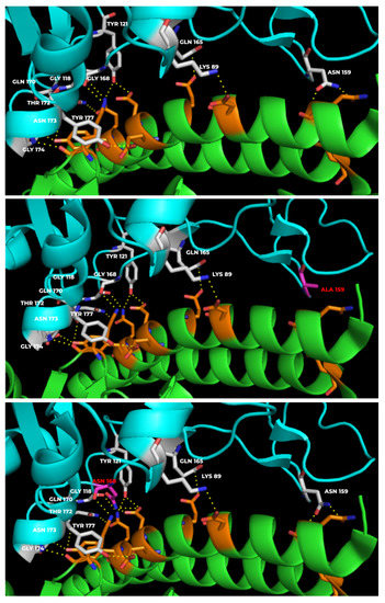 The mutant RBD-hACE-2r interface hydrogen bond profiles were analyzed to understand any changes in the hydrogen bonding pattern of the mutants compared to the wild type. As shown in Figure 5, the wild type showed 13 hydrogen bonds at the interface while the mutants N159A and G168N showed 11 and 15 hydrogen bonds, respectively, at the interface. The hydrogen bonding patterns for mutants were analyzed by systematically substituting all the eleven positions (Lys417, Gly446, Tyr449, Asn487, Gln493, Gly496, Gln498, Thr500, Asn501, Gly502, Tyr505) with all the 20 natural amino acids one amino acid at a time (Table S2). The amino acid numbering given in Table S2 is according to the numbering system followed in Figure 2. Interestingly, only selected amino acid substitutions showed changes in the hydrogen bonding pattern, so instead of analyzing the hydrogen bonding patterns for all the mutants, we calculated the binding affinity-based predicted relative viral fitness given in Table S2 and Figure 4.