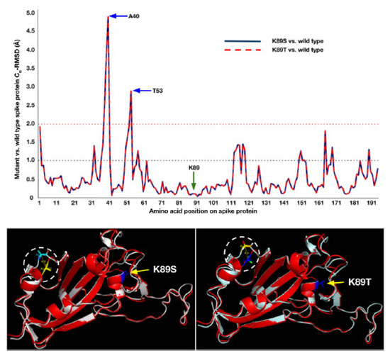 Structural deviation in the RBD of K89S/T mutants. The top panel shows RMSD of Cα atoms of mutants superposed onto wild type. Significant deviations were seen at positions 40 and 53. Bottom panels show the offsite structural deviations at position 40 on the respective mutant RBDs highlighted by white dashed circles.