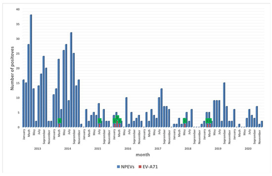 Monthly distribution of NPEV and EV-A71 identified in Senegal from 2013 to 2020. The shaded bars show positive specimens from patients for NPEV (in blue) and EV-A71 (in red). The green boxes with numbers (1 or 2) indicate the number of EV-A71-positive isolates.