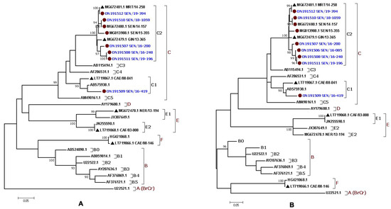 The generated sequences were manually curated using the GeneStudio software (GeneStudio ™ Pro, version: 2.2.0.0) and analyzed using the online Basic Local Alignment Search (BLAST) program (https://blast.ncbi.nlm.nih.gov/Blast.cgi, accessed on 28 February 2022) to compare the sequence homology with previously available sequences. In addition, the genotyping was confirmed using the online RIVM program (http://www.rivm.nl/mpf/enterovirus/typingtool/, accessed on 28 February 2022). Multiple alignments and tree inference were performed using the Muscle and Maximum Likelihood (ML) methods implemented in the MEGA 7.0 program. Two ML phylogenetic trees were inferred based on the 8 complete polyprotein sequences (~7400 bp) and the partial VP1 sequence (~775 bp) of the 9 isolates identified from Senegal, respectively. A total of 22 additional sequences previously available from NCBI were also used. Trees were inferred for 1000 replications, and nodes were supported by the bootstrap values. The evolutionary distances were estimated using the Tamura 3 parameter method. Bootstrap values ≥90 were shown on the tree, which was rooted on midpoints.