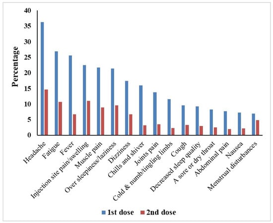 It was obvious in our study that the overall incidence of side effects is higher after the first dose than after the second dose. Headache (36.3% vs. 14.6%), tiredness and fatigue (26.9% vs. 10.7), fever (25.6% vs. 6.7%), pain or swelling at the injection site (22.5% vs. 11%), muscle pain (21.7% vs. 8.9%), over sleepiness/laziness (21.3% vs. 9.5%), and dizziness (17.4% vs. 6.7%) were the most common side effects reported after the first vs. second dose. That was in harmony with a previous study that confirmed that the side effects were most common after the first dose []. The occurrence of side effects after the first dose was almost three times higher than after the second dose. That was confirmed by a previous study that reported that the side-effect severity was greater after the first dose of Sinopharm and AstraZeneca than after the second dose, but in contrast, the side-effect severity was greater after the second dose of the Pfizer vaccine than after the first dose []. On the other hand, another study showed a significant increase in the number of subjects who were suffering side effects after receiving the second dose of the vaccine compared to those who reported side effects after the first dose [].