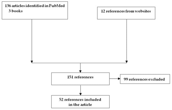 This is a non-systemic review. Articles published in PubMed through 1 March 2022 were selected using combinations of the words “air splatters”, “dental handpieces aerosol”, “dental office indoor air quality”, “ultrasonic cleaners emission”, and “infection control”. We also used information from websites and books. We read the abstracts of 151 references and excluded 99 based on the fact that they concerned data from hospitals or non-healthcare-associated workplaces. Overall, we included a total of 52 references based on their relevance to the studied topic (Figure 1).