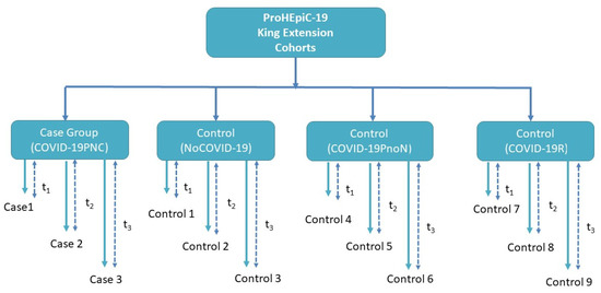 Figure 1. Nested case–control study in a cohort study. Persistent neurocognitive deficits in PCC (COVID19-19PNC) patients. The three control groups include PCC patients with no neurocognitive deficits (COVID-19PnoN), patients who had recovered from COVID-19 (COVID-19R), and healthy controls who did not have COVID-19 (NoCOVID-19).
