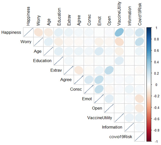 The data were analyzed using the statistical software R [74]. First, descriptive statistics were computed for the original survey data and the TIPI scale data. Mean and associated SD values as well as bivariate correlations were reported for the investigated variables, namely, emotions of happiness and worry after the vaccine; personal factors, including personality characteristics, age and education; and environmental factors, including vaccination confidence, perceived risk of COVID-19 and the amount of information participants had received regarding vaccines. In addition, we performed a series of regression analyses to explore the role of personal and environmental factors as predictors of change in emotional reactions (happiness and worry) and to explore the types of variables that contributed most to responses to anti-SARS-CoV-2 vaccines. More specifically, the following models were tested and compared: (1) Model 1, including age and education as predictors of happiness and worry; (2) Model 2, concerning personality as a predictor of happiness and worry; (3) Model 3, concerning vaccination confidence as a predictor of happiness and worry; (4) Model 4, concerning vaccination confidence and the amount of vaccine information received as predictors of happiness and worry; (5) Model 5, concerning vaccination confidence, amount of vaccine information received and COVID-19 perceived risk as predictors of happiness and worry; (6) Model 6, including all variables as predictors of happiness and worry. To compare the models and select the one that received the most support, we used comparative fit indices—the Akaike Information Criterion (AIC) and the Bayesian Information Criterion (BIC)—with lower values providing more support for one model as against the previous tested model [75]. Third, for an explorative target, the correlations between emotions after vaccination (happiness and worry) and the various modalities of vaccine promotion were examined (effect size: <0.10 = trivial, <0.30 = low, >0.30 = moderate, >0.50 = strong).