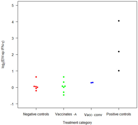Equine influenza virus-specific IFN-γ levels produced by PBMCs are illustrated in Figure 2. Although the median of vaccinates was numerically higher compared to control horses (0.07 and 0.03, respectively), the difference was not significant (p = 0.7; mixed-effects regression model). A statistically significant (p < 0.001) increase in IFN-γ production by PBMCs from experimentally infected (positive control) ponies was observed compared to control horses.