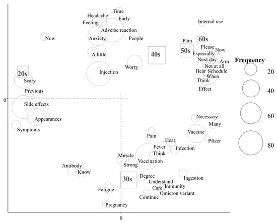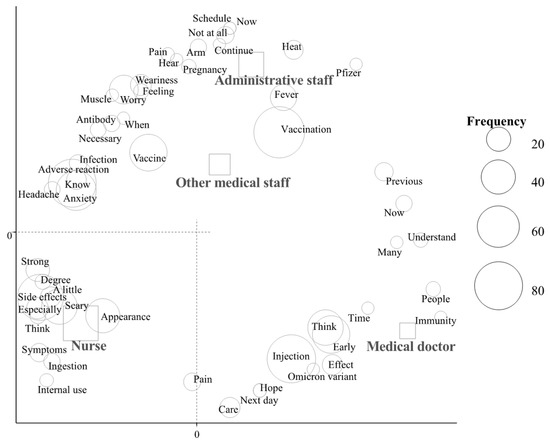 In the correspondence analysis (Figure 1 and Figure 2), characteristic words were “side effects” among subjects in their 20s and “pregnancy” among those in their 30s (Figure 1). Regarding job title, characteristic words were as follows: “immunity” and “time” by medical doctors, “side effects” and “scary” by nurses, “vaccination” and “vaccine” by other medical staff, and “fever” and “pregnancy” by administrative staff (Figure 2).