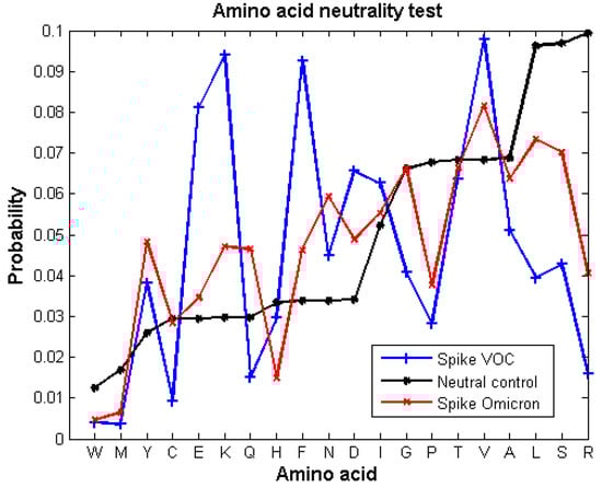 As described elsewhere [], a neutral evolution test was performed for every group of 100 sequences of each variant and for 100 sequences reported until June 2020. We built another group, taking sequences from all six groups. Our amino acid neutrality test considers that all positions have the same probability to mutate, with the sole constraint that they obey the degeneracy of the SGC. Briefly, for every set of sequences, they were pairwise aligned using MUSCLE [] using MEGA 11 software [,] using the default parameters. The alignment was used to generate a table of mutations that calculates the number of changes in codons. This table is transformed into an amino acid substitution matrix, which is then normalized to generate a probability transition matrix, from which a stationary probability distribution is obtained. The resulting calculation reveals the probability of occurrence of each amino acid in the protein if each amino acid has a uniform distribution of mutation. This model gives the probability of occurrence of each amino acid for a given protein and indicates the type of selective pressure exerted in each type of amino acid. If the probability of occurrence for an amino acid has a greater value than its corresponding value at the neutral control (a hypothetical protein subjected only to random changes), it will be interpreted as positive selection, and lower values will be considered as negative selection. The values that lie at or near to the neutral control will be interpreted as consistent with neutral or nearly neutral mutations. To assess the statistical robustness of the sample of sequences, a jackknife procedure was applied. A confidence interval of 95% was computed around the stationary distribution derived from the set of sequences.