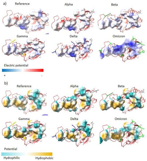 Interface of the RBD of each VOC. (a) Electric potential and (b) hydrophobic potential of the interface of the RBDs of each VOC.