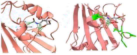 Only Omicron’s RBD presents mutations near a glycosylation site, specifically near N343. In fact, these set of mutations changed the entire glycosylation surroundings. These mutations caused the NAG that comes in contact with four residues from the same RBD chain, instead of only two residues as it occurs in other variants (i.e., F338, D339, F342 and N370, and with G339 and F338, respectively) (Figure 4). The RBD of the previous variants presented an interaction between S373 and S375, avoiding the interaction of N370 with the carbohydrate. In the Omicron RBD, the mutation P373S causes the interaction between Serines to break and also that they approaching to N370. Additionally, interactions within the trimer could be disturbed, and could alter epitopes that would be hardly detected by neutralizing antibodies.
