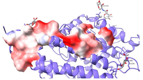 The mutations of Omicron’s RBD contribute to the increase in the binding affinity for the receptor. Firstly, the RBD establishes 82 contacts, in comparison to the 74 found in the Wuhan original viral protein, but uses 16 contacts residues instead of 17. Hence, the mean number of contacts per residue is higher, making the contact thermodynamically more stable. Other mutations are found on the RBD surface on one side, and these interact with the carbohydrates at the glycosylation site N343, changing both the structural conformation of the peptide and the chemical properties. In addition, the mutations at the RBDs’ interface change the electrostatic properties, from neutral to positive. The receptor’s surface presents negatively charged spots (Figure 5), such that both surfaces attract each other, increasing the binding affinity.
