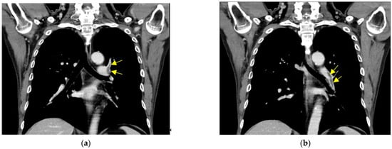 He was treated with enoxaparin twice daily following admission for 5 days, then this was changed to 60 mg endoxaban once daily. To date, his symptoms have improved without dyspnea.