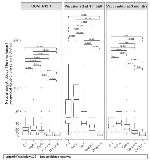 In Figure 1, the NtAb titers against different VOCs (B.1, Alpha, Delta, Gamma, and Omicron variants) are compared within each group (COVID-19+, V1, and V3). In all groups, higher NtAb titers were found against B.1 and Alpha, being lower against Delta and Gamma, while antibodies against the Omicron variant mostly did not reach the threshold for positive results (titer below 10).