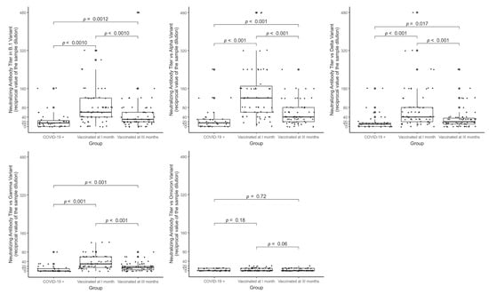 These results are confirmed by many studies that showed a substantial reduction in NtAb titers elicited by natural infection or complete-cycle vaccination toward the Delta and Gamma variants compared to B.1 and Alpha [,,,,]. Significantly decreased neutralization titers against the Omicron variant in vaccinees were also previously observed []. The finding of decreased neutralizing immunity against subsequent variants after natural infection may explain the recently reported rise in cases of reinfection with newer variants [,,,]. It is interesting to note that median NtAb titers in all groups were higher against the Alpha variant than against the B.1 strain. This suggests that both natural and artificial immunity could be more protective toward the Alpha strain than toward the first variant circulating in Italy. These results seem to be confirmed by several studies stating that 6 weeks after the administration of the 2nd dose of the vaccine, 92% of the samples showed an efficient neutralizing activity toward the B.1 and Alpha variants []. In reverse, a study conducted by Muik et al. [] on a group of two-dose vaccinees, evidenced slight but statistically significantly reduced NtAb titers against the Alpha variant compared with the B.1 Wuhan virus reference. Nevertheless, a slight reduction in titer should not be a biologically relevant change in terms of the neutralization efficacy.