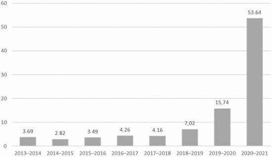Figure 1. Number of vaccinated HCWs from 2013–2014 influenza season to 2020–2021.