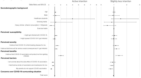 Table 2 and Figure 1 show the results of univariate and multinomial logistic regression analyses according to vaccine intention. Adjusting for age, sex, study course, smoking, drinking and exercise habits, and total scores of concerns, the multinomial models demonstrated that one unit of age (OR 1.10, 95% CI, 1.01–1.21) and students in the healthcare course (OR, 4.02, 95% CI, 2.11–7.67) compared to those in other courses were significantly associated with active intention. For perceived severity, life-threatening perception (OR, 1.40, 95% CI, 1.16–1.69) was significantly associated with an increased risk of active intention compared to no intention. The perception of serious social consequences was significantly associated with an increased risk of both active (OR, 1.23, 95% CI, 1.04–1.46) and slightly less intention (OR, 1.20, 95% CI, 1.02–1.42) compared to no intention. Perceived benefits had a 2.03-fold increased risk of active intention (95% CI, 1.66–2.49) and 1.39-fold increased risk of slightly less intention (95% CI, 1.15–1.68) compared to no intention. For perceived barriers, one unit increase of side effect and feeling troublesome were associated with a decreased risk of active intention, with the adjusted ORs of 0.69 (95% CI, 0.56–0.85) and 0.73 (95% CI, 0.61–0.86), respectively. For the barrier of parent disagreement, active and slightly less intention were lineary and inversely associated with one unit increase of parent disagreement compared to no intention, with the adjusted ORs of 0.42 (95% CI, 0.34–0.51) and 0.75 (95% CI, 0.61–0.91), respectively. Similarly, one unit increase of the total scores of concerns was inversely associated with slightly less intention compared to no intention, but the association was not significant with regard to active intention.