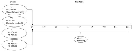 Proportionally by age (mean age of 3 years in all groups), the ewes were randomly allocated as follows: the V group (n = 6) consisted of ewes that received an annual booster dose of a polyvalent clostridial vaccine (dose rate: 2 ml SC; Panclostil, Ceva Hellas S.A.); the VE group (n = 6) consisted of those that were vaccinated and were intramuscularly injected with a solution of Vit E/Se (dose rate: 30 IU/kg BW; Vitamin E-Selen, MSD Animal Health Hellas) [17]; the E group (n = 6) consisted of those that were intramuscularly injected with a solution of Vit E/Se; and the C group (n = 6) consisted of those that did not receive either the vaccine or Vit E and Se, and served as controls. The dosage of Vit E was based on previously tested protocol [17]. In addition to the aforementioned interventions, the ewes of group V received an intramuscular placebo dose of normal saline (NS 0.9%) at the same volume of the Vit E/Se. Those of group E received a subcutaneous placebo administration of 2 ml of NS 0.9%, and the ewes of group C had both an intramuscular and a subcutaneous administration of NS 0.9% at the volume previously mentioned.
