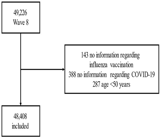 Initially, 49,226 participants were included. After removing 287 people younger than 50 years, 143 participants without information regarding influenza vaccination, and 388 without information regarding COVID-19, we included 48,408 participants in this analysis (Figure 1).