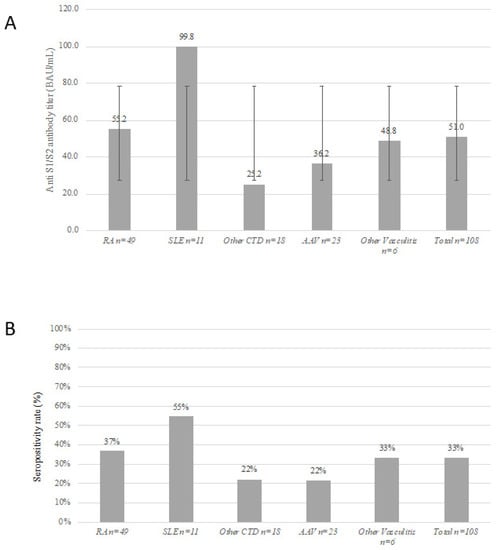 - Ammitzbøll, C.; Bartels, L.E.; Bøgh Andersen, J.; Risbøl Vils, S.; Elbaek Mistegård, C.; Dahl Johannsen, A.; From Hermansen, M.-L.; Kragh Thomsen, M.; Erikstrup, C.; Hauge, E.-M.; et al. Impaired antibody response to the bnt162b2 messenger RNA coronavirus disease 2019 vaccine in patients with systemic lupus erythematosus and rheumatoid arthritis. ACR Open Rheumatol. 2021, 3, 622–628. [Google Scholar] [CrossRef] [PubMed]