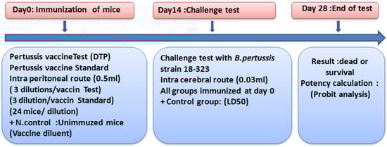 The mouse protection test steps (MPT) (Kendrick test): (1) Day 0: immunization of one group of 24 mice by one dilution, simultaneously with a whole-cell pertussis vaccine combined with diphtheria and tetanus antigens (DTP) and a standard pertussis vaccine (three dilutions/vaccine, 0.5 mL, intraperitoneally), Plus a negative control (N.control) of 10 non-immunized miceinjected with diluent vaccine. (2) Day 14: challenge test with a suspension of B. pertussis of all groups of mice (0.03 mL, Intracerebrally), plus a control group of non-immunized mice infected with B. pertussis (LD50 estimation). (3) Day 28: final reading and recording of surviving mice to estimate the potency relative to the pertussis vaccine tested (Probit analysis).