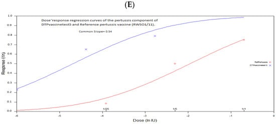 Estimation of dose response regression lines of the pertussis component of DTP vaccine test and reference pertussis vaccine (RWSO1/11) by the parallel line method using WHO combistats software(dose response regression curves of the proportion of surviving mice transformed to a probit as a function of the dose): (A)The pertussis component of DTP vaccine test 1 and reference pertussis vaccine (RWSO1/11),(B) the pertussis component of DTP vaccine test 2 and reference pertussis vaccine (RWSO1/11),(C) the pertussis component of DTP vaccine test 3 and reference pertussis vaccine (RWSO1/1), (D) the pertussis component of DTP vaccine test 4 and reference pertussis vaccine (RWSO1/11) (E) the pertussis component of DTPvaccine test5 and reference pertussis vaccine (RWSO1/11).