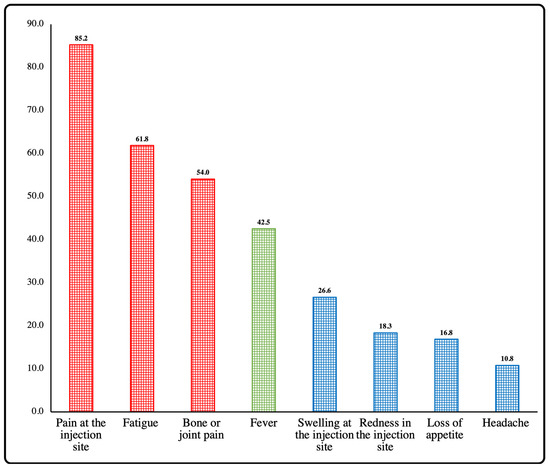The common side effects (presented in >50% of the study participants) were pain at the injection site, fatigue, and bone or joint pain, while fever was a moderately common side effect (presented in 30–50% of the study participants) presented in 42.5% of the participants. The uncommon side effects (presented in 10–30% of the study participants) were swelling or redness at injection site, loss of appetite, and headache (Figure 2). However, drowsiness, nausea, sexual disturbances, shortness of breath, tightness in hands, diarrhea, etc., were rarely reported side effects in this study (Figure 3).