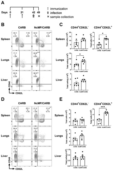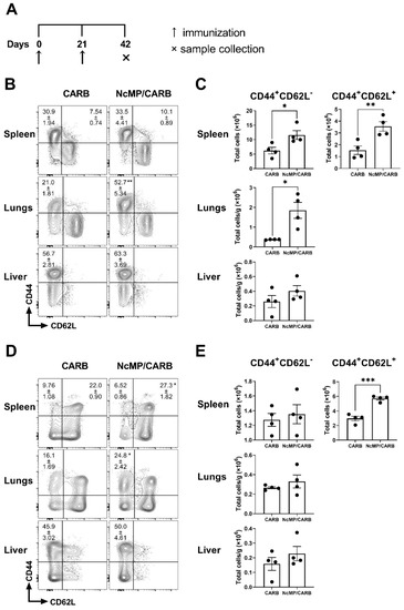Memory phenotype of CD4+ and CD8+ T cells. Timeline of immunization and sample collection (A). Representative contour plot analysis of gated CD4+ (B) and CD8+ (D) T cells expressing CD44 and CD62L in the indicated organs, 21 days after the boost immunization. Numbers within contour plots correspond to mean percentage values ± SEM for the particular quadrant region in the respective sham-immunized (CARB) or immunized (NcMp/CARB) groups, as indicated. Numbers of CD4+ (C) and CD8+ (E) T cells presenting the cell surface phenotypes CD44+CD62L− and CD44+CD62L+, as indicated, in the analyzed organs of CARB and NcMp/CARB groups. In panels (C,E), bars represent means, and each symbol (black circle) represents an individual mouse ± SEM. Results are of one representative experiment out of two independent experiments that yielded concordant results (n = 4 group; * p < 0.05; ** p < 0.01; *** p < 0.001, unpaired t-test).