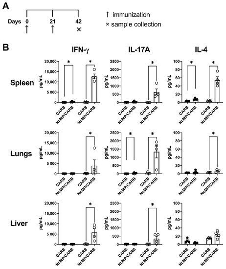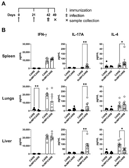 Analysis of cytokine production. Timeline of immunization and sample collection (A). IFN-γ, IL-17A and IL-4 concentration (B) in the supernatants of leukocyte cell cultures unstimulated (closed circles) or stimulated (open circles) for 3 days with N. caninum whole parasite antigen sonicates. Cells were isolated from the spleen, lungs and liver of mice from NcMP/CARB or control CARB groups, as indicated, 21 days after the boost immunization. Each symbol represents an individual mouse; bars correspond to the mean value in each group ± SEM. Results are from one representative experiment out of two independent experiments that yielded concordant results. (n = 4 group; * p < 0.05, Mann–Whitney.)