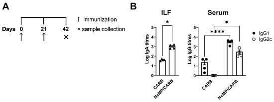 Analysis of N. caninum-specific antibodies. Timeline of immunization and sample collection (A). Titers of intestinal lavage fluid (ILF) IgA and serum (Serum) IgG1 and IgG2c (B), as indicated, were determined by ELISA in samples collected, on the indicated day, from mice of CARB and NcMP/CARB groups. Data is presented as log10 of the antibody titers (n = 4 per group). Each symbol (triangles and circles) represents an individual mouse. Bars correspond to the mean value in each group ± SEM. Results are of one representative experiment out of two independent experiments that yielded concordant results (n = 4 group; * p < 0.05; **** p < 0.0001, Mann–Whitney).