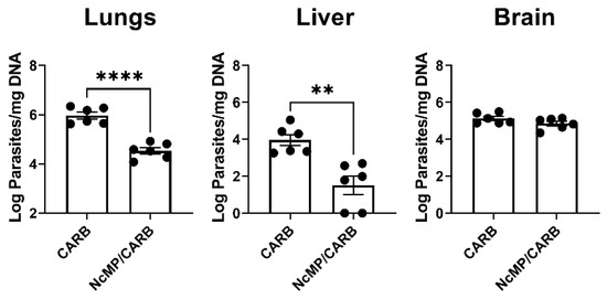 To assess whether the induced response could protect against N. caninum infection, mice of the CARB and NcMP/CARB groups were infected i.p. with 1 × 107 N. caninum tachyzoites three weeks after the boost immunization. As shown in Figure 4, 7 days upon infection, the NcMP/CARB group presented lower parasitic burdens in the lungs and liver than the sham-immunized CARB group. No significant difference was found in the brain parasitic burden. These results show that the used immunization procedure conferred partial protection against the disseminated N. caninum infection established i.p.