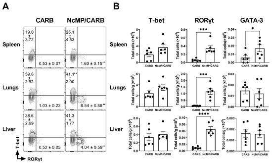 To determine the type of cellular response induced upon infection in the immunized mice and controls, we evaluated the expression of the transcription factors T-bet, GATA-3 and RORγt, respectively, associated with Th1, Th2 and Th17 cell populations [40] in antigen-experienced (CD44+) CD4+ T cells. As shown in Figure 7, immunized mice clearly presented higher proportions and numbers of activated/memory CD4+ T cells expressing RORγt in all analyzed organs. In the spleen, GATA-3-expressing CD4+ T cells were also increased in the NcMP/CARB group. Splenic T-bet-expressing CD4+ T cells were detected at elevated numbers and proportions in immunized mice, although not reaching statistical significance. Similar results were found when evaluating the expression of these transcription factors in gated CD4+ TEM cells (Figure S3).