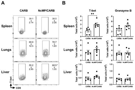 Expression of T-bet and granzyme B in CD8+ T cells of infected mice. (A) Representative contour plot analysis of CD8+ CD44+ T cells expressing T-bet in the indicated organs of sham-immunized (CARB) or immunized (NcMp/CARB) mice, as indicated, 7 days after i.p. challenged with 1 × 107 N. caninum tachyzoites. Numbers within contour plots correspond to mean percentage values ± SEM of T-bet expressing cells within the CD8+ CD44+ T cell population. (B) Numbers of CD8+ CD44+ T-bet+ and CD8+CD44+ granzyme B+ cells in the indicated organs of immunized and sham-immunized mice. Each symbol (black circle) represents an individual mouse. Results are representative of two independent experiments that yielded concordant results (n = 6 group; * p < 0.05; ** p < 0.01, unpaired t-test).