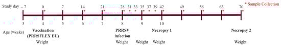 Blood samples, as well as oral swabs (sterile dry cotton swabs), were collected on study days 0, 14, 21, 28, 31, 33, 35, 37, 39, 42, 49, 56, 63, and 70 to evaluate viral RNA copy numbers in sera and in swabs. Serum was also used to detect PRRSV-specific antibodies. The blood samples were centrifuged, and the sera were collected in capped tubes and frozen at –80 °C. Oral swabs were also stored at –80 °C until further processing.