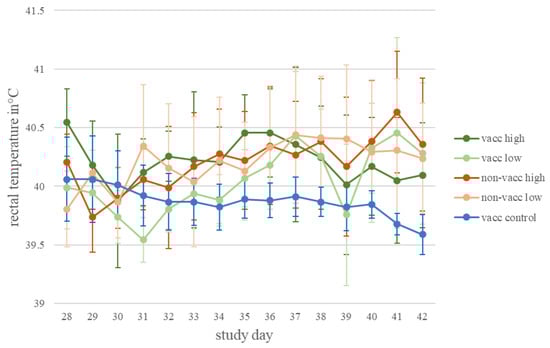 Rectal temperature. Mean and standard deviation of rectal temperature for each treatment group (vacc high: vaccinated, high dose [105 TCID50/dose] infected; vacc low: vaccinated, low dose [103 TCID50/dose] infected; non-vacc high: non-vaccinated, high dose infected; non-vacc low: non-vaccinated, low dose infected; vacc control: vaccinated, non-infected) after infection (study day 28 to 42).