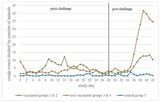 Cough monitor results. Cough events divided by the number of animals in each room (vaccinated, infected (groups 1 and 2), non-vaccinated, infected (groups 3 and 4), and vaccinated control (group 5) animals) per study day from study day 0 to study day 42.