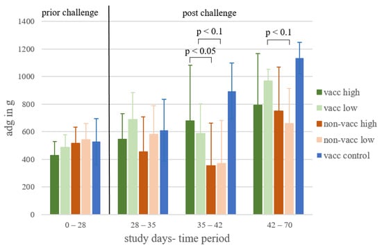 The average weight of the piglets per treatment group on study day 0 was between 6.5 and 7.5 kg, and the differences between treatment groups were not statistically significant. The average daily weight gain of each treatment group for different time periods is shown in Figure 4. In the first time period (prior to challenge, study days 0–28), the mean ADG of the piglets ranged from 427.9 g to 542.9 g without significant differences between vaccinated and non-vaccinated groups (p > 0.05). In the second week after challenge (study days 35–42), vaccinated, high-dose-infected piglets showed significantly higher ADG (p < 0.05) than non-vaccinated, high-dose-infected animals. During the same time period, vaccinated, low-dose-infected piglets showed a numerically higher ADG (p < 0.1) compared to non-vaccinated, low-dose-infected piglets. In the last time period (study days 42–70), vaccinated, low-dose-infected piglets again showed a numerically higher ADG (p < 0.1) compared to non-vaccinated, low-dose-infected piglets.