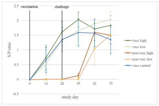 After infection on study day 28, the non-vaccinated, high-dose-infected animals showed a faster increase in the S/P ratio (mean ± sd S/P ratio on study day 35: 0.12 ± 0.08; study day 42: 1.6 ± 0.29) compared to the animals of the non-vaccinated, low-dose-infected group (study day 35: 0 ± 0.03; study day 42: 1.04 ± 0.56).