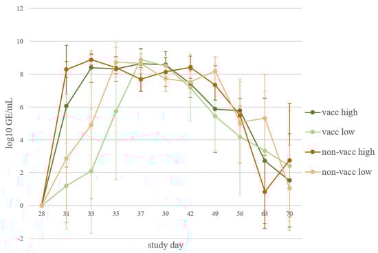 Viral load in serum. Mean and standard deviation of qRT-PCR results from serum samples (log10 GE/mL) of each infected group (vacc high: vaccinated, high dose [105 TCID50 /dose] infected; vacc low: vaccinated, low dose [103 TCID50/dose] infected; non-vacc high: non-vaccinated, high dose infected; non-vacc low: non-vaccinated, low dose infected) at different time points after infection (study days).