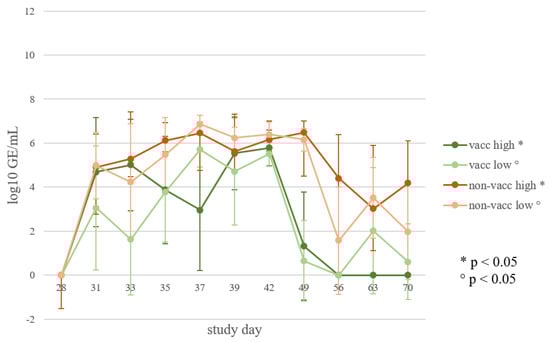 Viral load in oral swabs. Mean and standard deviation of qRT-PCR results from oral swabs (log10 GE/mL) of each infected group (vacc high: vaccinated, high dose [105 TCID50 /dose] infected; vacc low: vaccinated, low dose [103 TCID50/dose] infected; non-vacc high: non-vaccinated, high dose infected; non-vacc low: non-vaccinated, low dose infected) at different time points after infection (study days). Significant differences in the AUC values are indicated (p < 0.05).