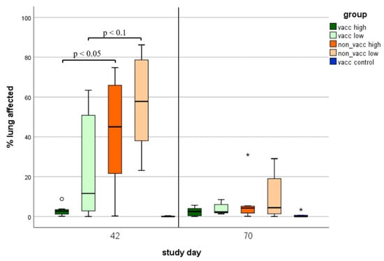 Macroscopic lung lesions. Total lung lesion score (corresponding to % of lung affected) of animals necropsied on either study day 42 (first necropsy) or study day 70 (second necropsy) in each group (vacc high: vaccinated, high dose [105 TCID50 /dose] infected; vacc low: vaccinated, low dose [103 TCID50/dose] infected; non-vacc high: non-vaccinated, high dose infected; non-vacc low: non-vaccinated, low dose infected; vacc control: vaccinated, non-infected). Boxplots show 25th and 75th percentiles and median values, and whiskers show minimum and maximum values within 1.5 × interquartile range (IQR). Outliers are values with more than 1.5 × IQR (indicated using circles °), and extreme values are values with more than 3 × IQR (indicated using asterisks *). P-values < 0.1 are indicated using brackets.