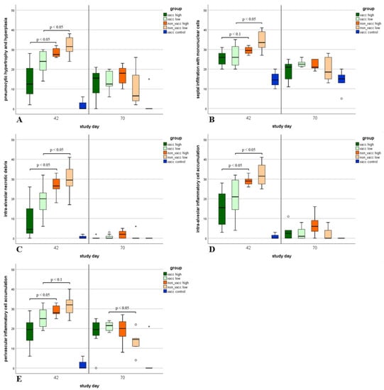 Histologic lung lesions. Histologic lung lesions of animals necropsied on either study day 42 (first necropsy) or study day 70 (second necropsy) in each group (vacc high: vaccinated, high dose [105 TCID50 /dose] infected; vacc low: vaccinated, low dose [103 TCID50/dose] infected; non-vacc high: non-vaccinated, high dose infected; non-vacc low: non-vaccinated, low dose infected; vacc control: vaccinated, non-infected). All seven lung lobes from each piglet were scored histologically for severity and extension (scored as 0: no lesion; 1: mild; 2: moderate; or 3: severe) of the following five lesions: pneumocytic hypertrophy and hyperplasia (A), septal infiltration with mononuclear cells (B), intra-alveolar necrotic debris (C), intra-alveolar inflammatory cell accumulation (D), and perivascular inflammatory cell accumulation (E). Maximum score was 42 per lesion per piglet. Boxplots show 25th and 75th percentiles and median values, and whiskers show minimum and maximum values within 1.5 × interquartile range (IQR). Outliers are values with more than 1.5 × IQR (indicated using circles °), and extreme values are values with more than 3 × IQR (indicated using asterisks *). p-values < 0.1 are indicated using brackets.