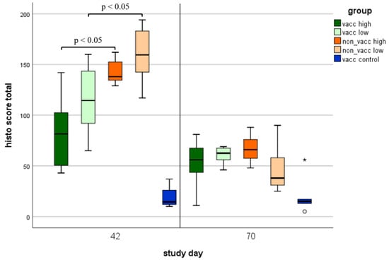 Total histo score. Total histo score of animals necropsied on either study day 42 (first necropsy) or study day 70 (second necropsy) in each treatment group (vacc high: vaccinated, high dose [105 TCID50 /dose] infected; vacc low: vaccinated, low dose [103 TCID50/dose] infected; non-vacc high: non-vaccinated, high dose infected; non-vacc low: non-vaccinated, low dose infected; vacc control: vaccinated, non-infected). Boxplots show 25th and 75th percentiles and median values, and whiskers show minimum and maximum values within 1.5 × interquartile range (IQR). Outliers are values with more than 1.5 × IQR (indicated using circles °), Extreme values are values with more than 3 × IQR (indicated using asterisks *). Significant differences (p < 0.05) between vaccinated and non-vaccinated piglets are indicated.