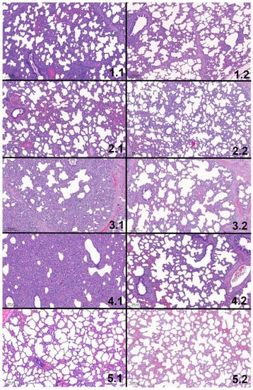 At termination, every piglet was humanely euthanized according to current animal welfare regulations in Hungary. Complete necropsies were performed on all piglets, and pathologic findings were recorded. Tissue samples were collected to assess viral loads in the lungs, tracheobronchial lymph nodes, and tonsils. One sample of each of the seven lung lobes (2 × 2 cm) of each piglet was fixed in 10% neutral buffered formaldehyde solution for 24–48 h, dehydrated with a series of alcohol and xylene, and subsequently embedded in paraffin wax. Then, 3–4 µm thick slices were cut and mounted on glass slides for routine staining with hematoxylin and eosin for histologic evaluation of lung lesions.